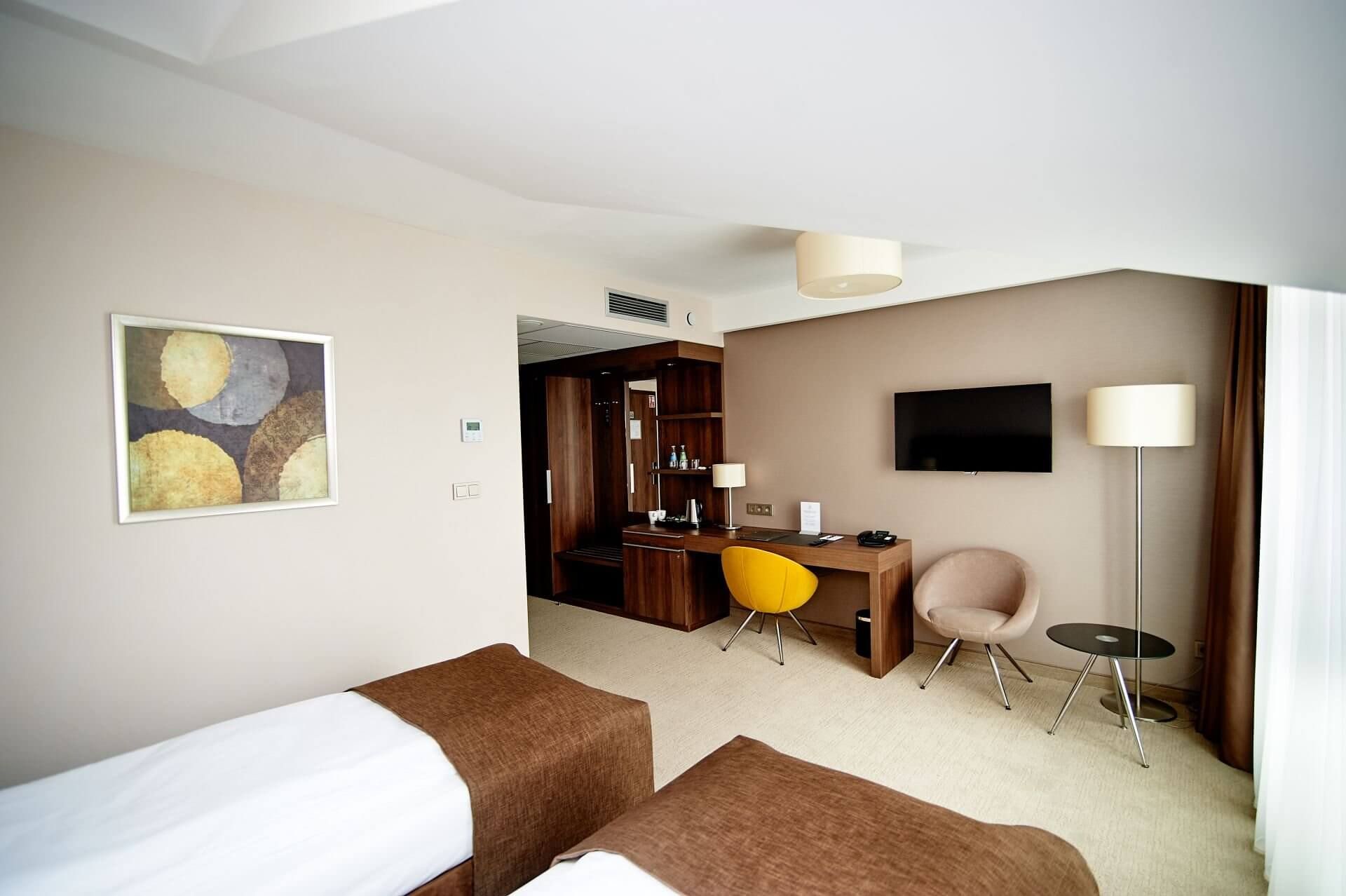 - TV, WiFi, sejf, biurko, łazienka z wanną lub prysznicem, kosmetyki, suszarka; bezpłatny minibar w apartamentach